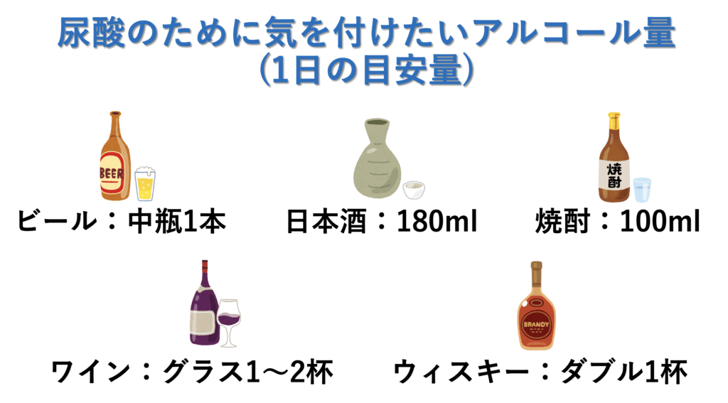 また排泄も減らすため体にたまりやすいです。確かにビールはプリン体を含むため、二重で尿酸を上げることから飲み過ぎには注意が必要です。