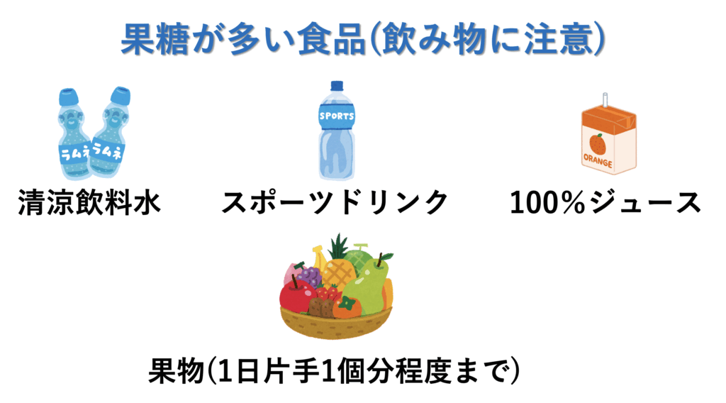 三つ目は、「果糖」です。果糖自体にプリン体は含みませんが、代謝の過程で尿酸を産生します。