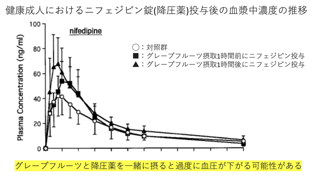 グレープフルーツジュースに含まれる成分は、薬を代謝する酵素の働きを阻害します。これにより、薬が体内に長くとどまり、効果や副作用が強く出る可能性があります。ニフェジピンという血圧を下げる薬や、アトルバスタチンというコレステロールを下げる薬などと飲み合わせが悪いです。