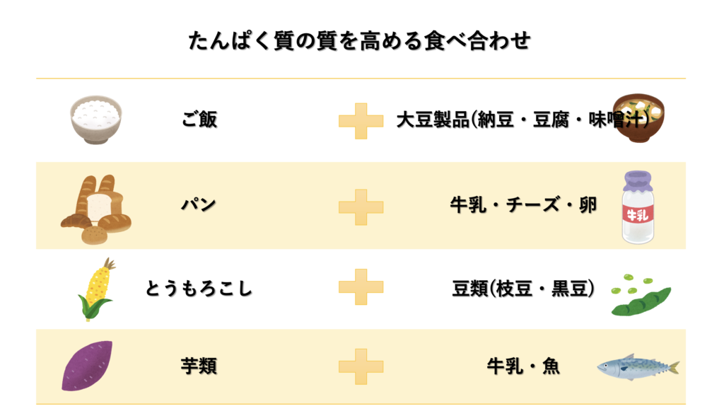 この質とは、必須アミノ酸をどれだけバランスよく含んでいるかを指します。この質が高いほど、食べたたんぱく質を効率よく筋肉などに利用することができます。