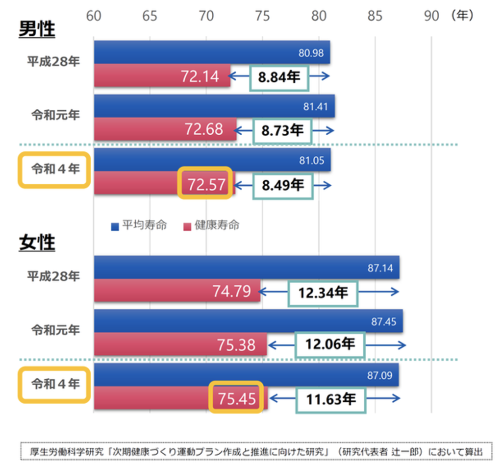 健康寿命といのは、厚生労働省で定義されていて、『健康上の問題で日常生活が制限されることなく生活できる期間』と定められていますが、この健康寿命と平均寿命との間には、約10年間あると言われています。つまり最後の10年というのは、家族の人や誰かに手伝ってもらいながら生きるということになります。なので、この差をできるだけ短くしたいと皆さん思っておられると思います。